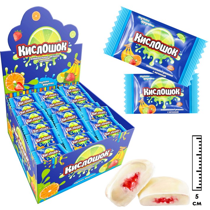 Жевательная резинка Кислошок с начинкой тутти-фрутти (Россия) 4г2,37 руб. за штуку (в упак. 100 шт.) |